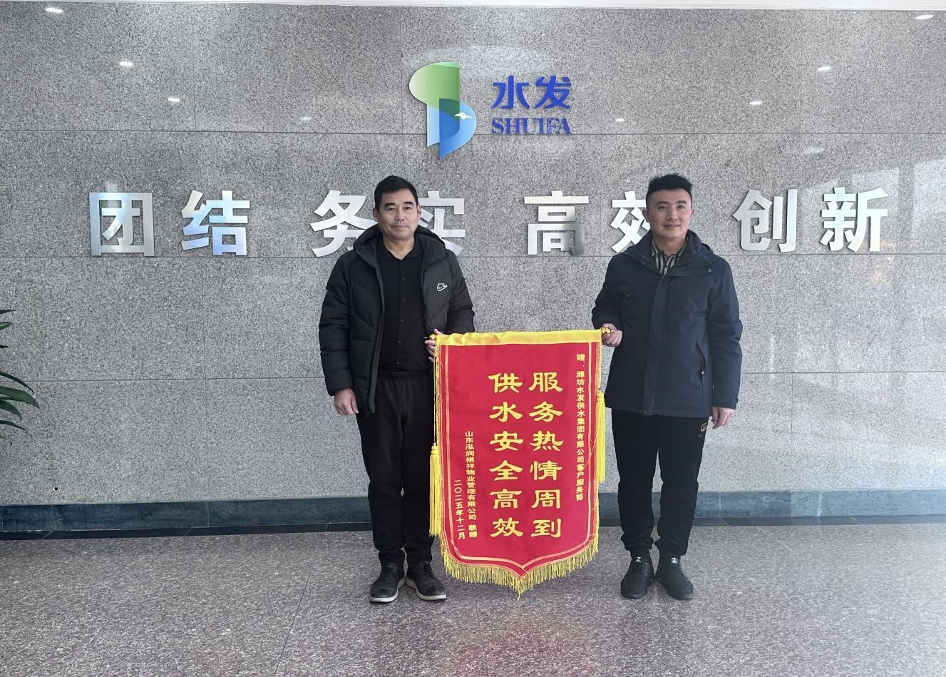 2025年 12月8日,濰坊水發(fā)供水集團(tuán)有限公司客服部迎來(lái)了特殊的客人,合作物業(yè)代表將一面印有 “服務(wù)熱情周到 供水安全高效” 的鮮紅錦旗鄭重遞交到客服團(tuán)隊(duì)手中,以最質(zhì)樸的方式,表達(dá)對(duì)供水服務(wù)的由衷感激。